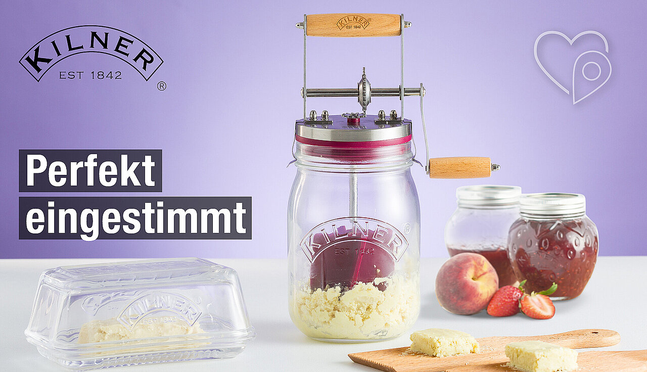 Mit dem Kilner® Butterfass lässt sich frische, selbstgemachte Butter in nur wenigen Minuten selbst herstellen. Schnell, sauber und einfach kreierst du mit dem retrostyle Butterfass von Kilner leckere Butter - ganz frisch und cremig und ohne Zusatzstoffe. Das Butterfass ist gleichzeitig eine stilvolle Ergänzung für deine Küche. Einfach Sahne in den Butterwender geben, den Griff drehen und in weniger als zehn Minuten kannst du deine Butter genießen! Perfekt auch für Kräuter-, Knoblauchbutter und mehr.