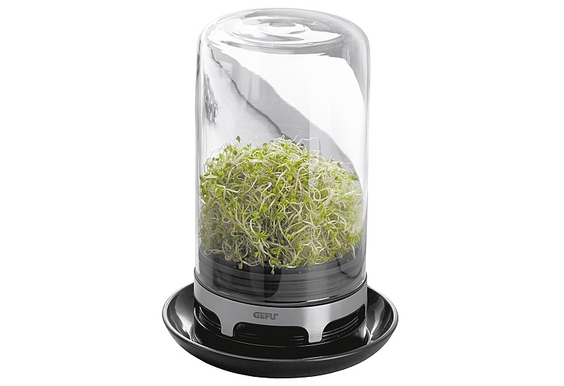 Das Sprossenglas "Bivita" von GEFU ist das ideale Anzuchtset für alle Sprossenliebhaber. Es besteht aus Glas, Silikon, ABS- Kunststoff und hochwertigem Edelstahl. Es eignet sich für Keimsaaten wie Alfalfa, Mungobohnen, Radieschen, Kichererbsen, Weizen und Linsen. Die Glaskuppel sorgt für optimale Lichtverhältnisse. So können Sie Ihre Saat bestens züchten und sogar dabei zusehen. Im Edelstahlsockel befindet sich eine integrierte Belüftung und er dient zusätzlich als Auffangbehälter für abtropfendes Wasser. Das Sprossenglas kann problemlos in der Spülmaschine gereinigt werden. Es hat Maße von 12,8x 18,4 cm.