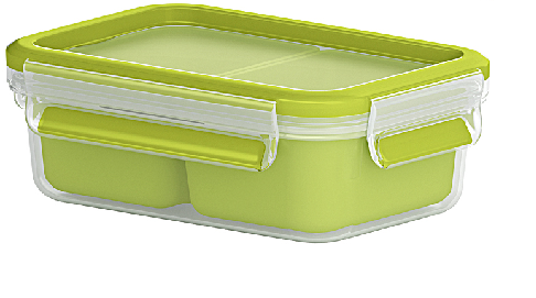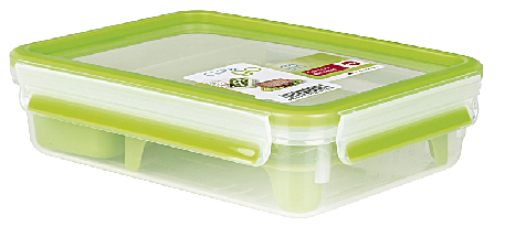 Die Snackbox Clip & Go von EMSA empfiehlt sich für Ihr nächstes Picknick. Sie besitzt einen transportsicheren Clipverschluss und eine einzigartige EMSA FRISCHE-Dichtung. Die Dose ist 100% dicht und selbst flüssige Lebensmittel können problemlos transportiert werden. Das eingespritzte Gummi besteht aus thermoplastischen Elastomeren und der Deckel und das Unterteil bestehen aus Kunststoff. Die Box besitzt zwei Einsätze, ist rechteckig und fasst 1 l. Mit ihrem grünen Deckel ist sie ein echter Hingucker.