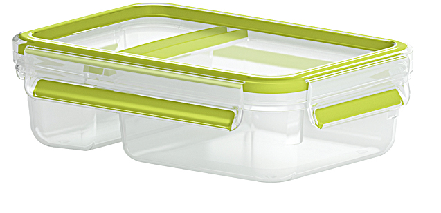 Die Brunchbox Clip & Go von EMSA ist rechteckig und fasst 1,2 l. Sie hat einen Gittereinsatz für zwei Ebenen sowie einen extra Einsatz für Snacks wie beispielsweise Gemüsesticks. Die Dose ist 100% dicht und kann selbst flüssige Lebensmittel transportieren. Das eingespritzte Gummi besteht aus thermoplastischen Elastomeren und der Deckel mit grünem Rand, sowie das transparente Unterteil bestehen aus Kunststoff. Die Maße der Brunchbox beträgt 22,5x 16,3x 5,8 cm.
