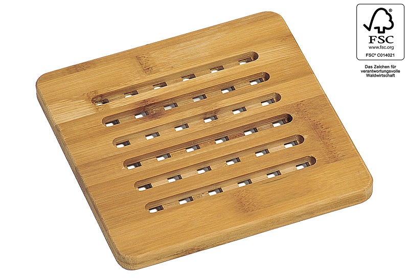 Der Untersetzer von KESPER empfiehlt sich für sämtliche Töpfe und Salatschalen. Er besteht aus FSC- zertifiziertem Bambus und hat Maße von 19x 19x 1,5 cm. Er ist quadratisch mit kleinen, rechteckigen Löchern und ist ein echter Hingucker und Helfer.