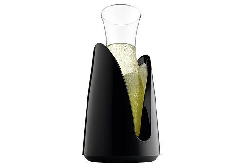 Der Flaschen- und Karaffenkühler von VACU VIN lässt die Temperaturen Ihrer Getränke im Nu purzeln. Der Kühler schmiegt sich einfach perfekt an jede Flasche und beschleunigt somit die Kühlzeit. Mit ihm können Sie Ihre Eiswürfel getrost im Gefrierfach lassen. Mit dem stylischen Tischkühler, der über zwei Kühlelemente an den Innenseiten verfügt, werden Ihre Getränke, wie beispielsweise Wein oder Fruchtsaft, innerhalb von Minuten auf die ideale Temperatur runtergekühlt. Die Karaffe hat ein glattes, modernes Design, welches einfach jeden Tisch schmückt! Der Kühler ist in schwarz erhältlich und die Karaffe fasst eine Menge von 1 l.