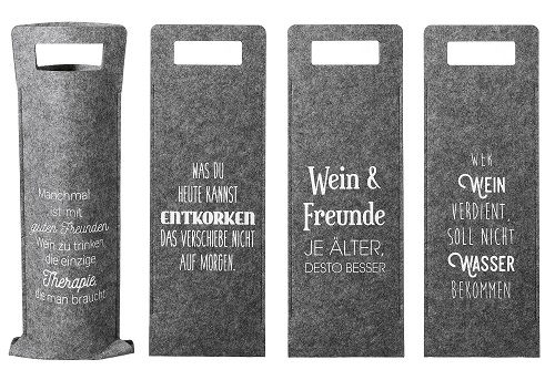 Schnell noch ein kleines Mitbringsel für die Party finden? Mit einer Flasche Wein haben Sie immer das richtige Geschenk dabei. Und die lustige Filz-Flaschentasche mit flottem Spruch, sorgt garantiert für ein kleines Lächeln bei Ihrem Gastgeber. Die Flaschentasche hat eine Maße von 41 x 14 und ist aus grauem Filz.